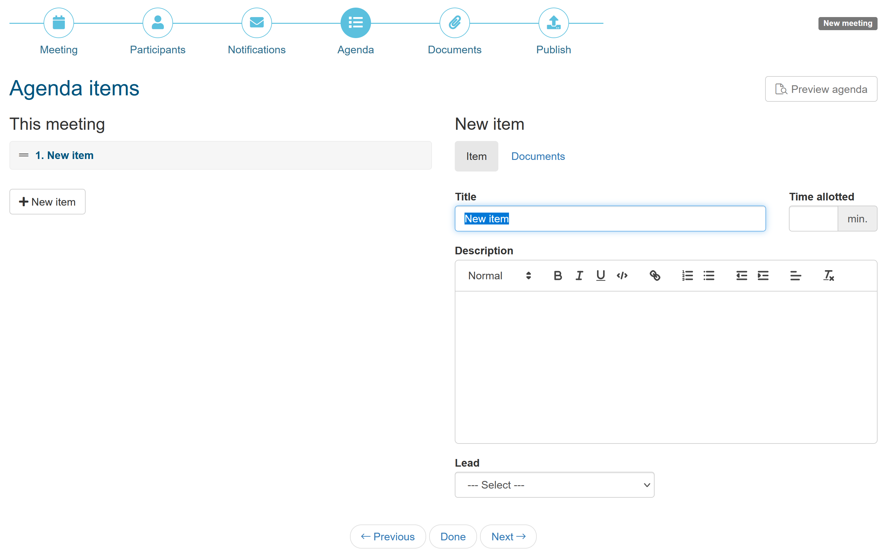 Enter a title and optional description for each agenda item and optionally select the lead for this item. You can add as many items as required but to keep it easy and simple, the ad hoc agenda does not support sections and sub-sections like the regular meeting agendas.
