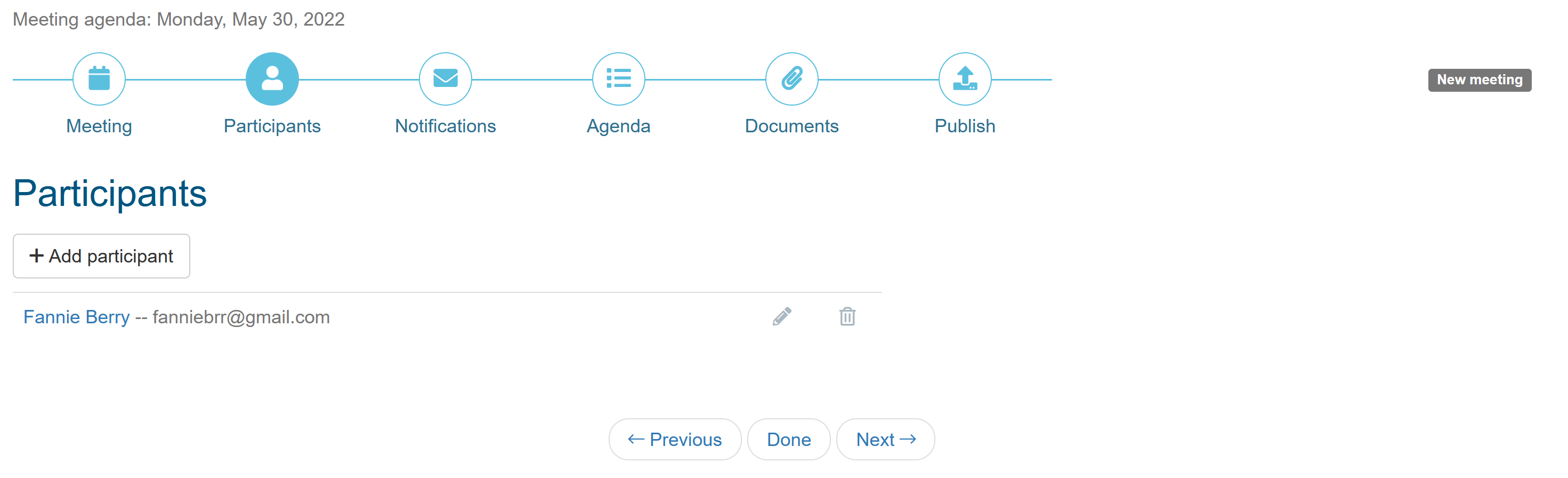 When you add a new participant, you can either select participants from your contact list or add a new person by entering their name and email address. Your contact list will contain the names of all people that are members of the board or committees you are a member of.