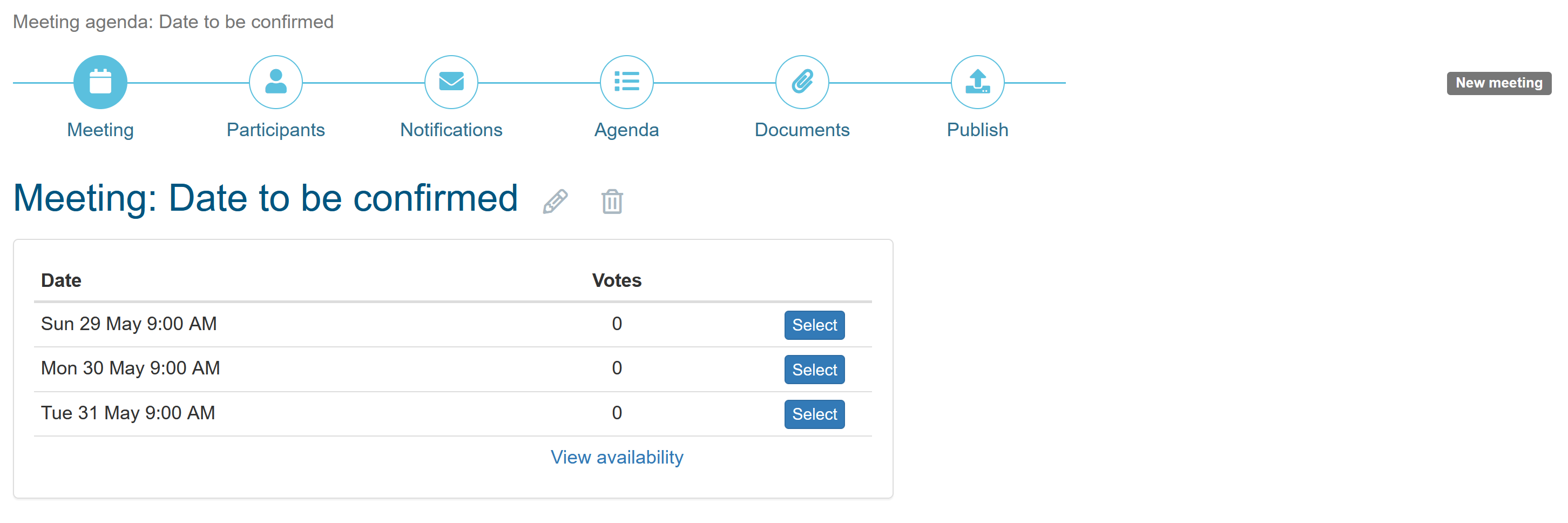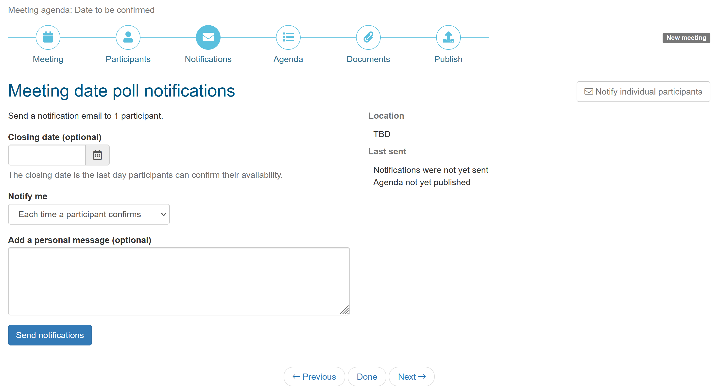 At any time, you can verify the availability of participants on the Meetings tab of the wizard and select the best possible meeting date. Once selected, notify participants of the selected date using the notifications tab or when you publish the agenda.