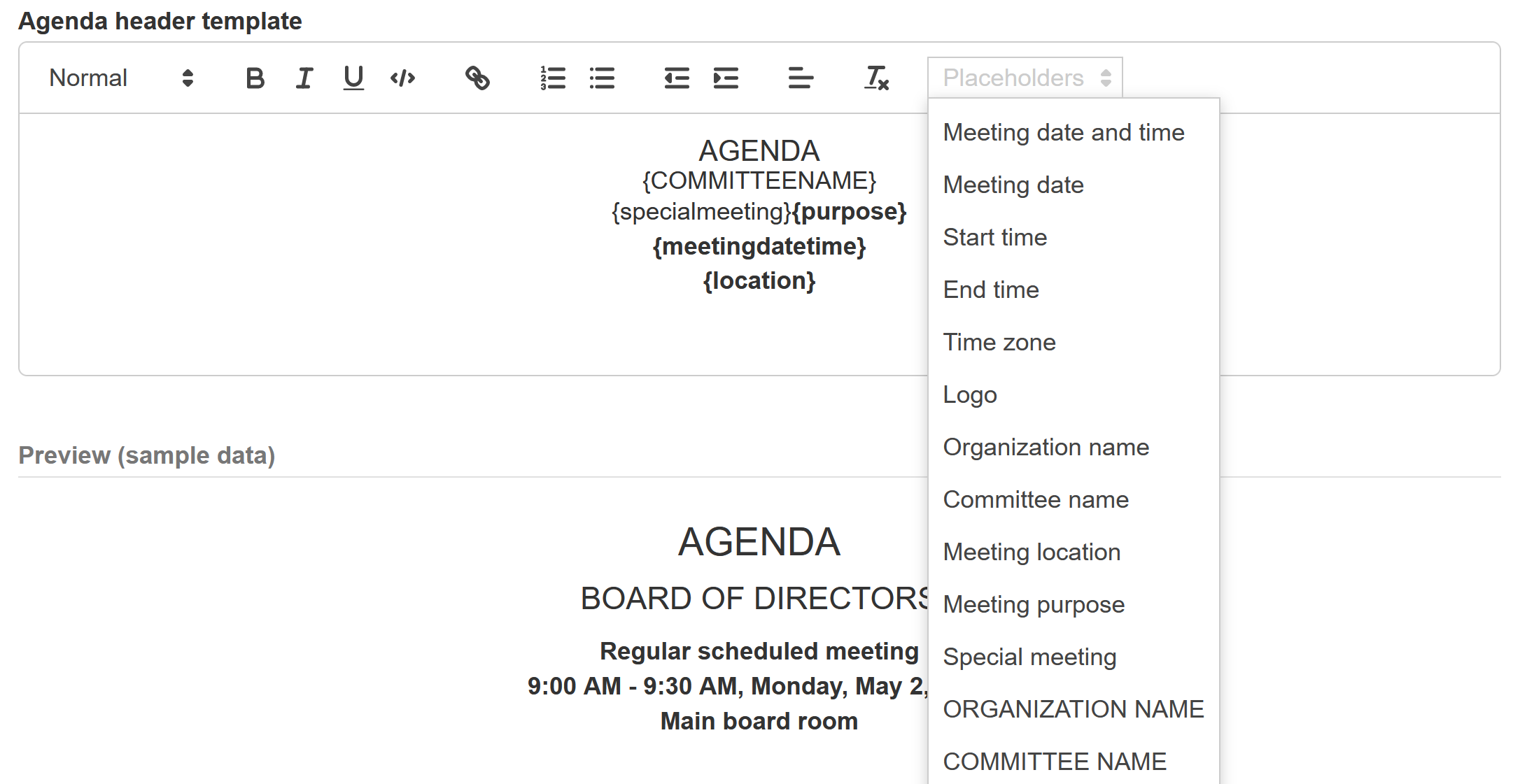 Agenda and minutes footers also have placeholders and can be customized as well.
