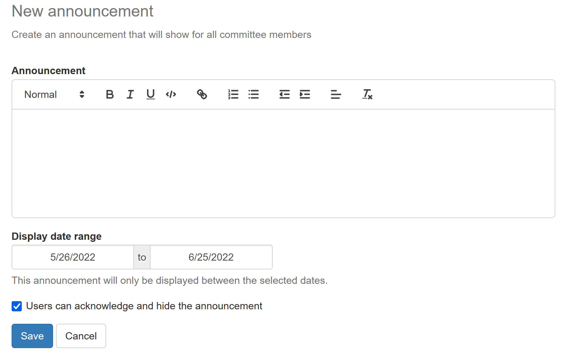 An announcement is a message or notice to members of your organization. A committee admin can enter an announcement at the committee level for members of a specific committee only. (E.g. " All Budget reviews are due by the end of this month". An organization admin can publish announcements at the organization level that are visible to all members of the organization (E.g. "New meeting guidelines available in the organization documents area").