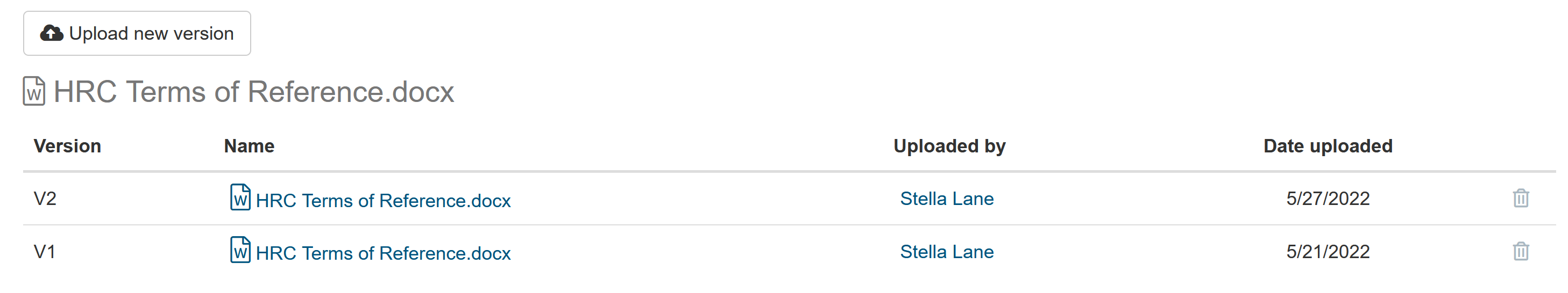 Each document has the option to upload a new version of that document. If you upload a document as a new version of an existing document, the documents are linked together for future reference and a version number is generated automatically and added as a label to the document.