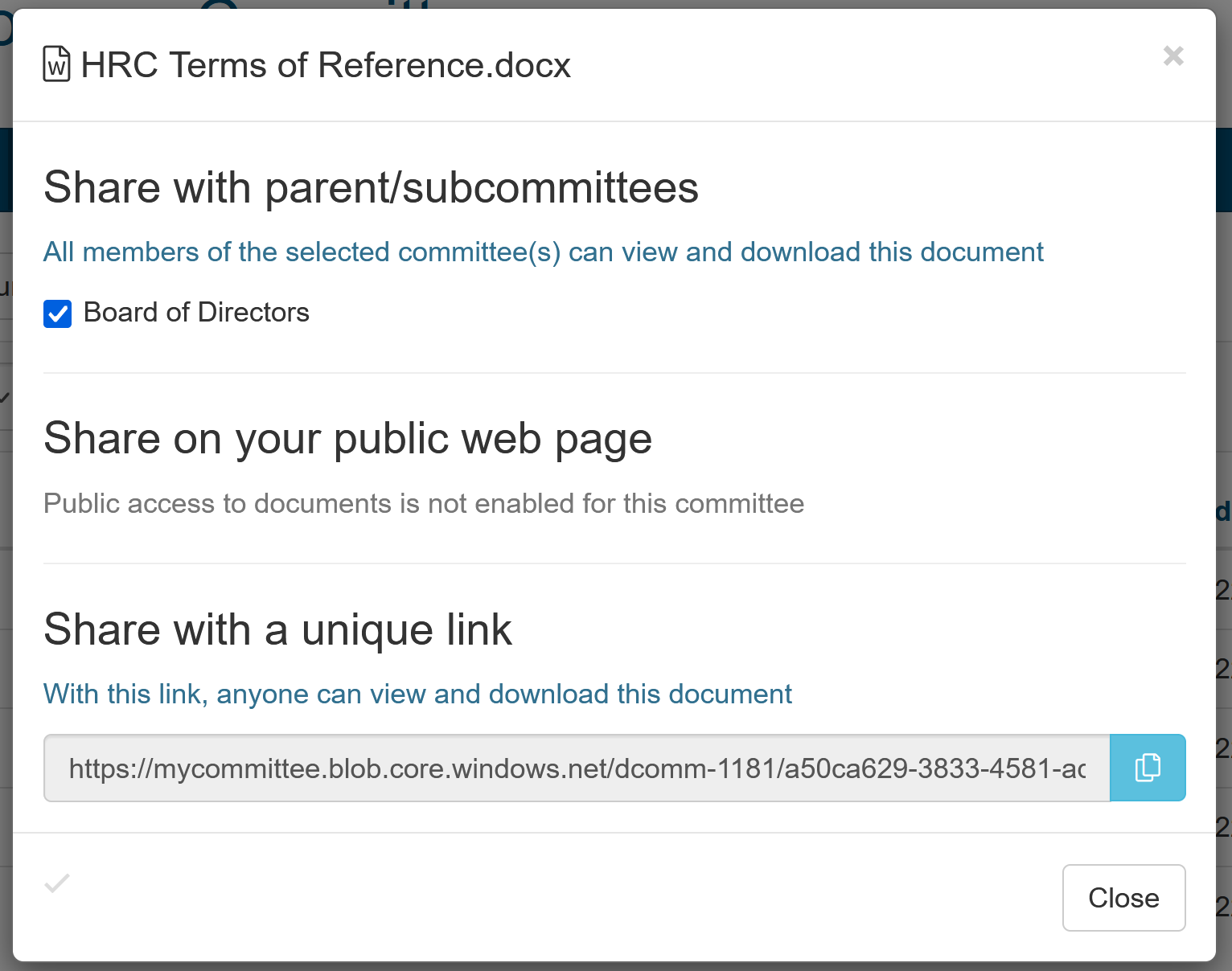 If you have a public webpage enabled for your committee, you will have the option to share individual documents on that page. By default, the public webpage is disabled and you have to enable it under committee settings. Learn more about enabling a public web page here.