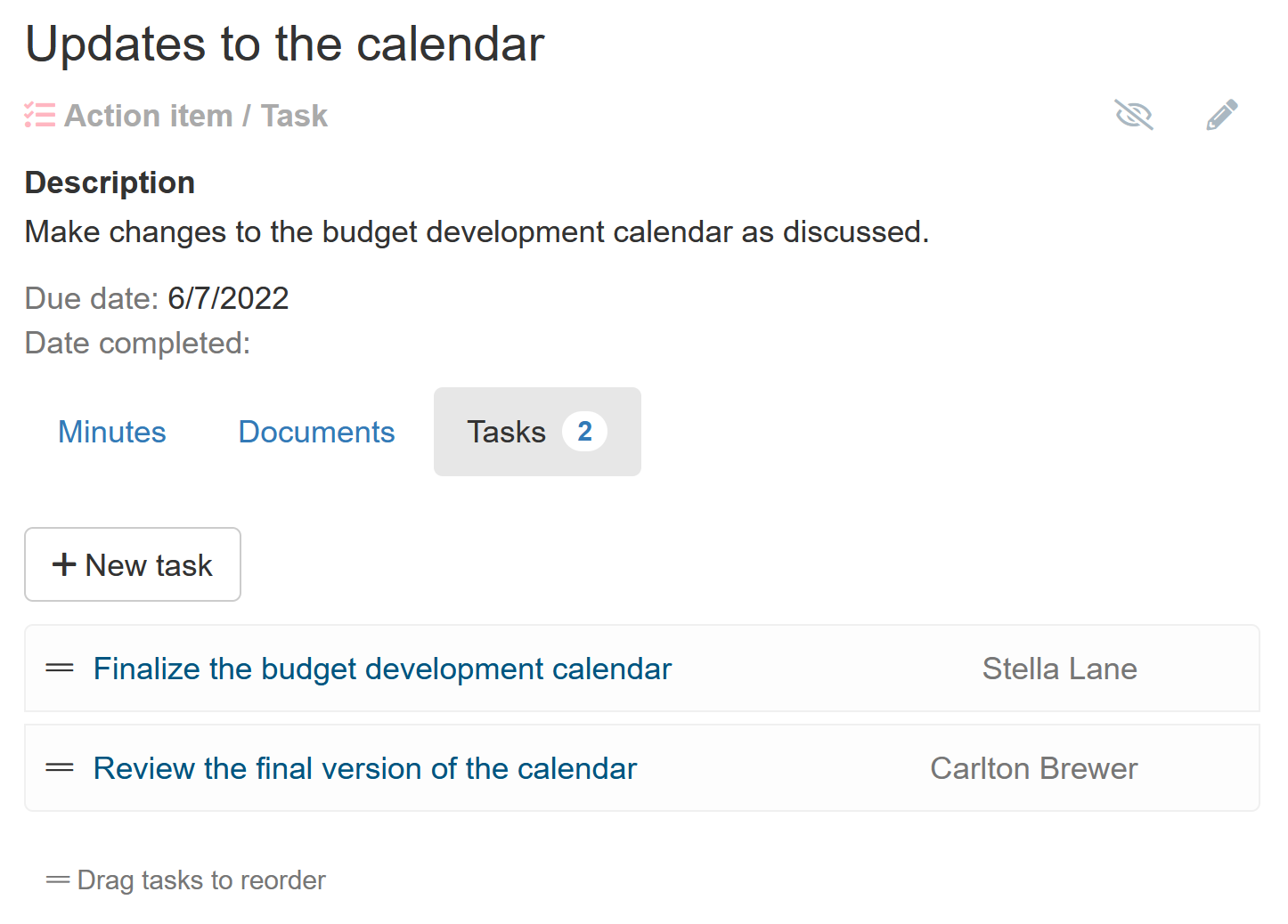 You can add as many tasks as required and order them by dragging. Each task created here is a committee task and will always be linked to this action item for future reference.