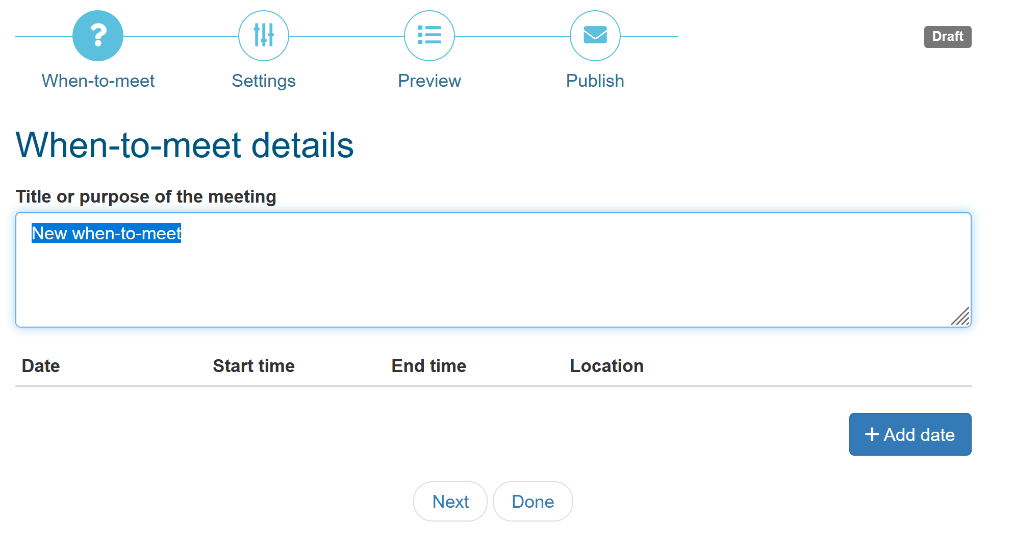 Enter a title for the meeting and click on ‘Add date’ to start adding dates. You can add as many dates as required. (End time and location are optional).